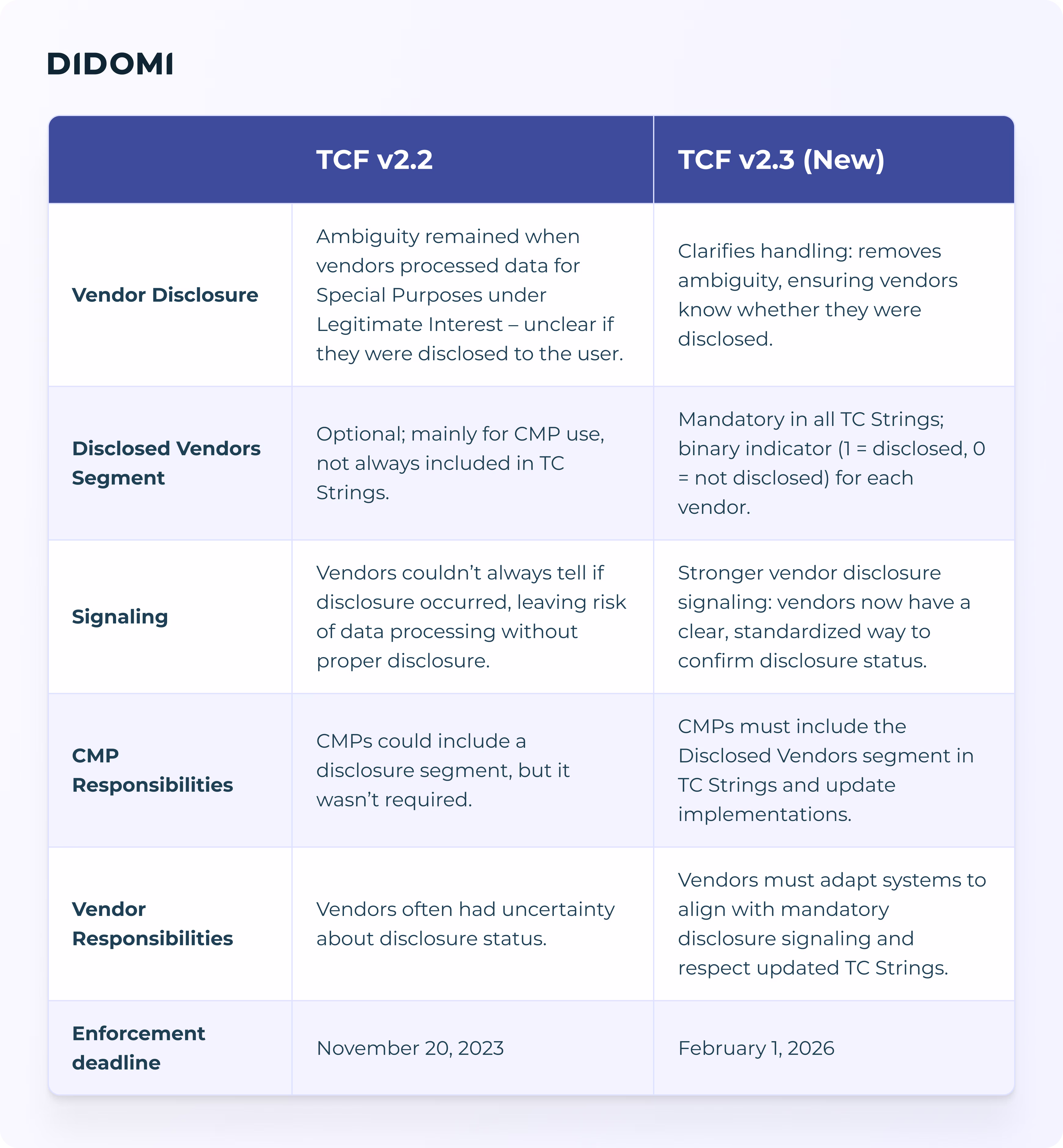 Side-by-side comparison of TCF v2.2 vs v2.3