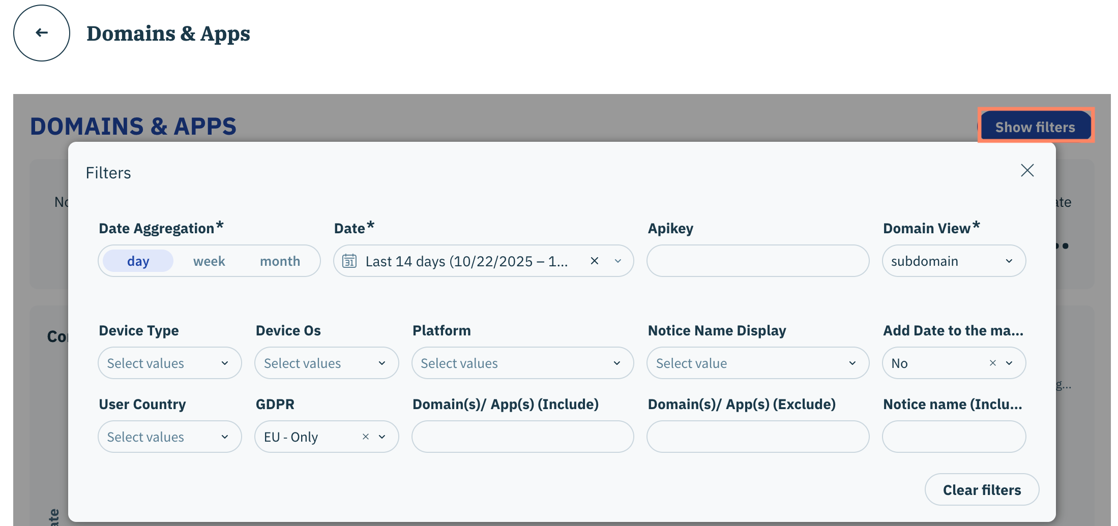 <table><thead><tr><th width="199.41665649414062">Filtrer</th><th>Description</th></tr></thead><tbody><tr><td>Agrégation des dates</td><td><p>Sélectionnez si les données du tableau de bord sont affichées par :</p><ul><li>Jour</li><li>Semaine</li><li>Mois</li><li>Horaire (pour les tableaux de bord Exploration)</li></ul></td></tr><tr><td>Date</td><td>Configurez la période pour les données représentées dans le tableau de bord. Votre organisation peut choisir entre des périodes prédéfinies (par ex. les 14 derniers jours) ou désigner des dates de début et de fin spécifiques.</td></tr><tr><td>Apikey</td><td>Filtre les données du tableau de bord pour correspondre aux clés API configurées utilisées pour les implémentations.</td></tr><tr><td>Vue du domaine</td><td>Sélectionnez si les tableaux du tableau de bord doivent afficher les données pour chaque sous-domaine ou domaine.</td></tr><tr><td>Type d'appareil</td><td>Filtre les données du tableau de bord pour inclure/exclure les données selon différents appareils (par ex. smartphone, télévision, tablette)</td></tr><tr><td>Système d'exploitation de l'appareil</td><td>Filtre les données du tableau de bord pour inclure/exclure les données selon les systèmes d'exploitation (par ex. iOS, Android, etc...)</td></tr><tr><td>Plateforme</td><td>Filtre les données du tableau de bord pour inclure/exclure les données selon les SDK Didomi (par ex. SDK mobile, SDK web, SDK CTV)</td></tr><tr><td>Affichage du nom de l'avis</td><td>Filtre booléen (Oui/Non) qui ajoute le nom de l'avis en tant que dimension dans le tableau de bord.</td></tr><tr><td>Ajouter la date au tableau principal</td><td>Filtre booléen (Oui/Non) qui inclura l'agrégation des dates dans les données du tableau de bord afin que votre organisation puisse visualiser les performances par jour, semaine ou mois (en fonction de l'agrégation des dates sélectionnée)</td></tr><tr><td>Pays de l'utilisateur</td><td>Filtre les données du tableau de bord pour inclure/exclure le pays de l'utilisateur final lorsqu'il a accédé à votre site/app.</td></tr><tr><td>RGPD</td><td>Filtre les données du tableau de bord pour inclure/exclure les pays qui peuvent ou non être soumis au Règlement général sur la protection des données (RGPD)</td></tr><tr><td>Domaine(s)/Application(s) (Exclure)</td><td>Exclure les domaines/applications dont le nom ou le motif correspond des données du tableau de bord.<br><br><mark style="color:par défaut;background-color:$warning;"><strong>Remarque</strong>:</mark> <a href="../../../commencer/general/expression-reguliere-regex"><mark style="color:par défaut;background-color:$warning;">Cliquez ici</mark></a> <mark style="color:par défaut;background-color:$warning;">pour en savoir plus sur l'utilisation des expressions régulières (regex) pour ce filtre.</mark></td></tr><tr><td>Domaine(s)/Application(s) (Inclure)</td><td>Inclure les domaines/applications dont le nom ou le motif correspond dans les données du tableau de bord.<br><br><mark style="color:par défaut;background-color:$warning;"><strong>Remarque</strong>:</mark> <a href="../../../commencer/general/expression-reguliere-regex"><mark style="color:par défaut;background-color:$warning;">Cliquez ici</mark></a> <mark style="color:par défaut;background-color:$warning;">pour en savoir plus sur l'utilisation des expressions régulières (regex) pour ce filtre.</mark></td></tr><tr><td>Nom de l'avis (Inclure)</td><td>Inclure les avis dont le nom ou le motif correspond dans les données du tableau de bord.<br><br><mark style="color:par défaut;background-color:$warning;"><strong>Remarque</strong>:</mark> <a href="../../../commencer/general/expression-reguliere-regex"><mark style="color:par défaut;background-color:$warning;">Cliquez ici</mark></a> <mark style="color:par défaut;background-color:$warning;">pour en savoir plus sur l'utilisation des expressions régulières (regex) pour ce filtre.</mark></td></tr><tr><td>Id d'expérience</td><td>Pour les tests A/B, filtre les données du tableau de bord par l' <code>identifiant</code> variable configurée pour la <code>expérience</code> propriété. <a href="https://developers.didomi.io/cmp/web-sdk/ab-tests#configuration">Cliquez ici</a> pour plus d'informations.</td></tr><tr><td>Statut d'implémentation Didomi CMP</td><td>Filtre les données du tableau de bord pour inclure/exclure les implémentations CMP pouvant présenter des erreurs.</td></tr><tr><td>Statut d'implémentation GCM</td><td>Filtre les données du tableau de bord pour inclure/exclure les implémentations CMP utilisant Google Consent Mode qui sont configurées correctement ou incorrectement.</td></tr></tbody></table>