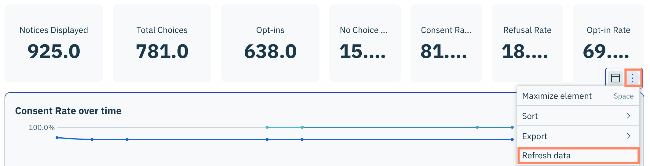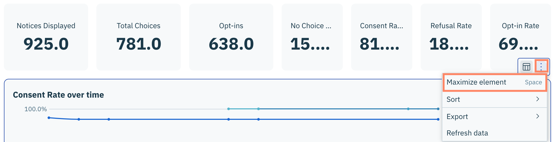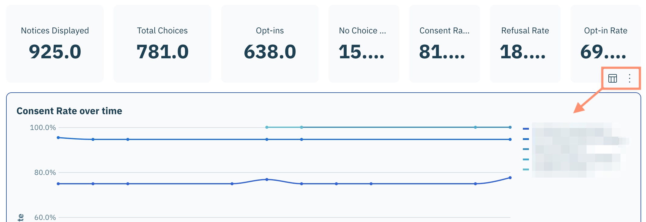 Pour accéder au menu d'actions d'une visualisation, cliquez **Analytics** dans le panneau de gauche et assurez-vous que **Consent Management Platform** onglet est sélectionné.