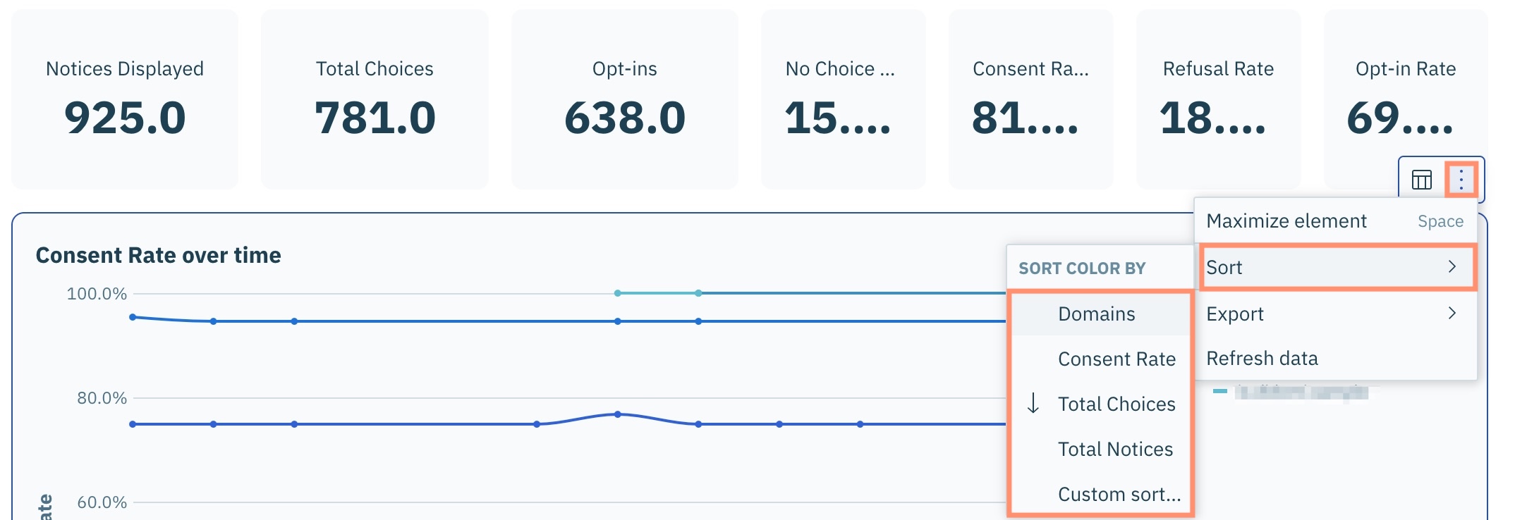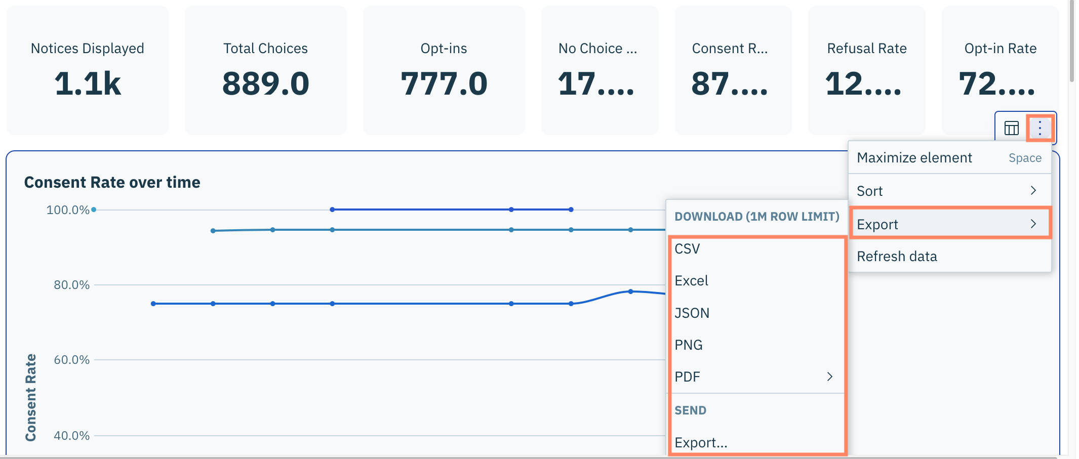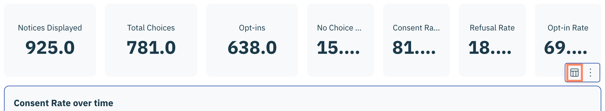 Pour accéder au menu d'actions d'une visualisation, cliquez **Analytics** dans le panneau de gauche et assurez-vous que **Consent Management Platform** onglet est sélectionné.