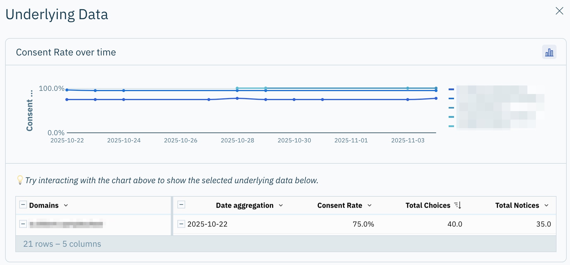 Interagissez avec le graphique dans la fenêtre pour examiner davantage les données sous-jacentes d'une tendance, d'un point de données, etc.