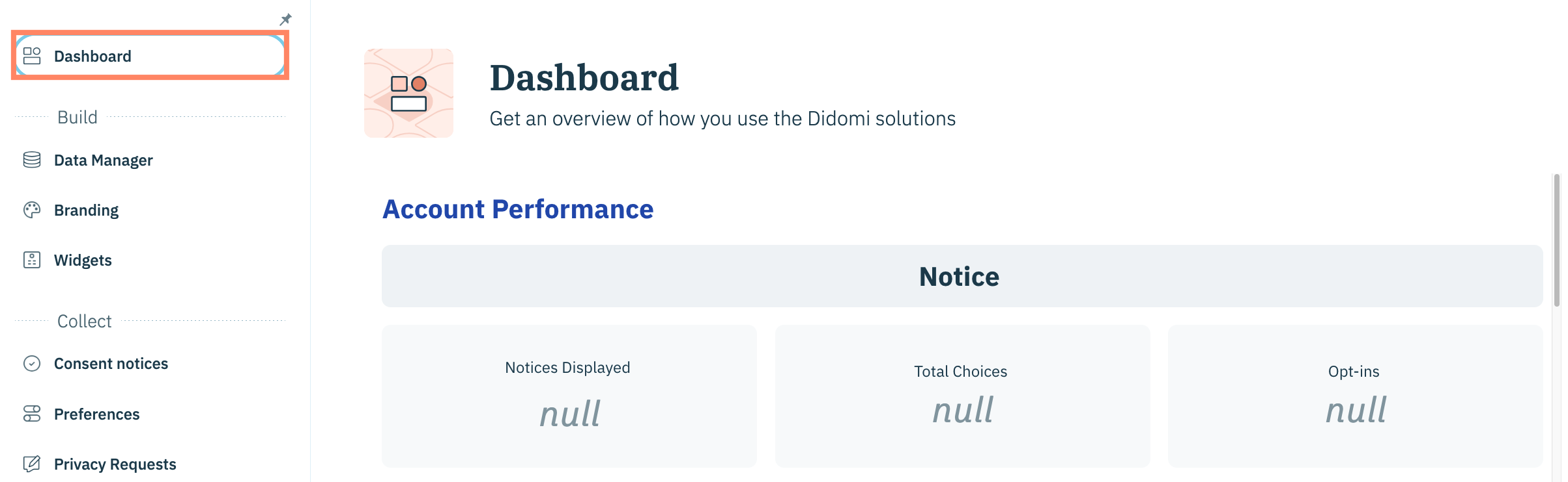 Le tableau de bord Acount Performance dans Didomi CMP analytics permet à votre organisation de visualiser des [Portée de l'avis CMP](https://open-2v.gitbook.com/url/preview/site_0sVi5/~/revisions/2D5bFhrKiOHMfFyUtnim/analytics/consent-management-platform-cmp-analytics/cmp-metrics/cmp-metric-glossary#cmp-notice-scope) et [Portée du trafic CMP](https://docs.didomi.io/moIvfcA7NSpjmwGZ7dzv/fr/analytique/metriques-cmp/glossaire-des-metriques-cmp#cmp-traffic-scope) indicateurs clés pour différents types de notifications de consentement. Dans cet article, nous fournirons un bref aperçu des données et des visualisations présentes dans le tableau de bord Account Performance.