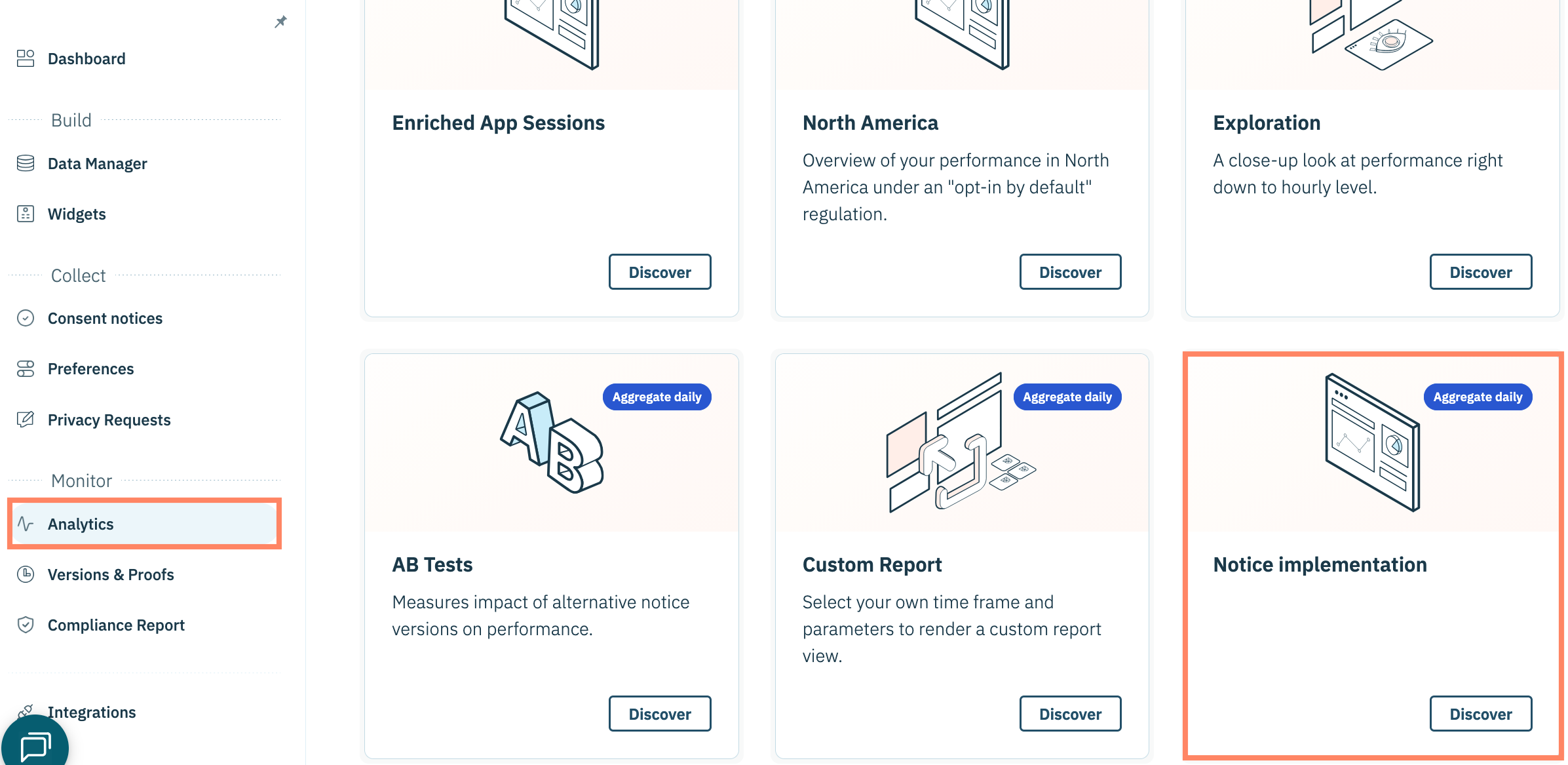 Pour commencer, cliquez **Analytics** dans le panneau de gauche et sélectionnez la **Implémentation de l'avis** carte sur la page suivante.