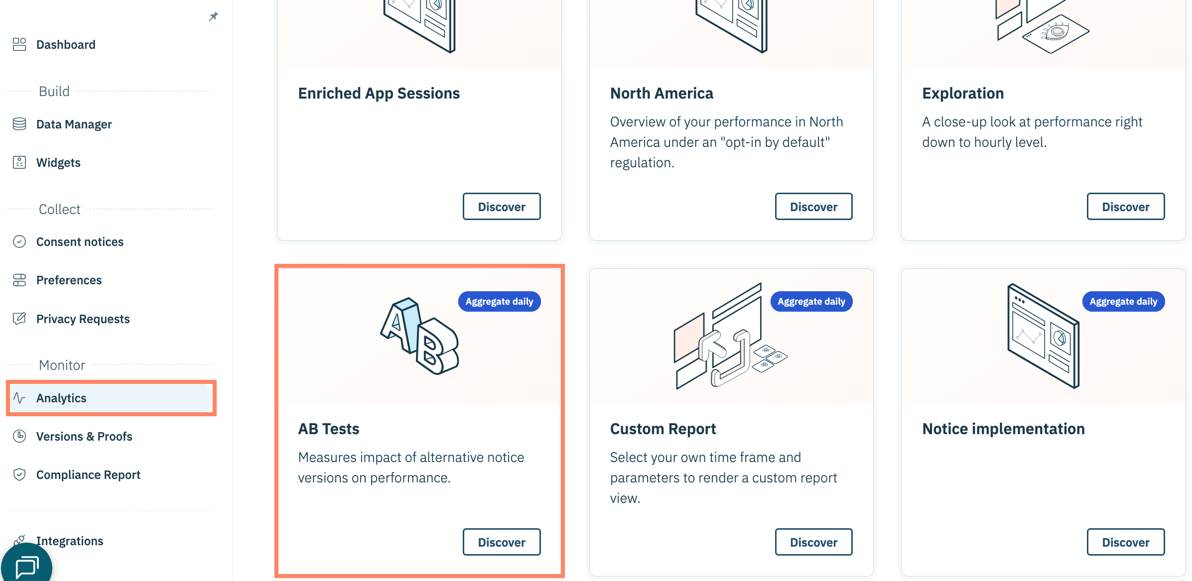Pour commencer, cliquez **Analytics** dans le panneau de gauche et sélectionnez la **Tests AB** carte sur la page suivante.