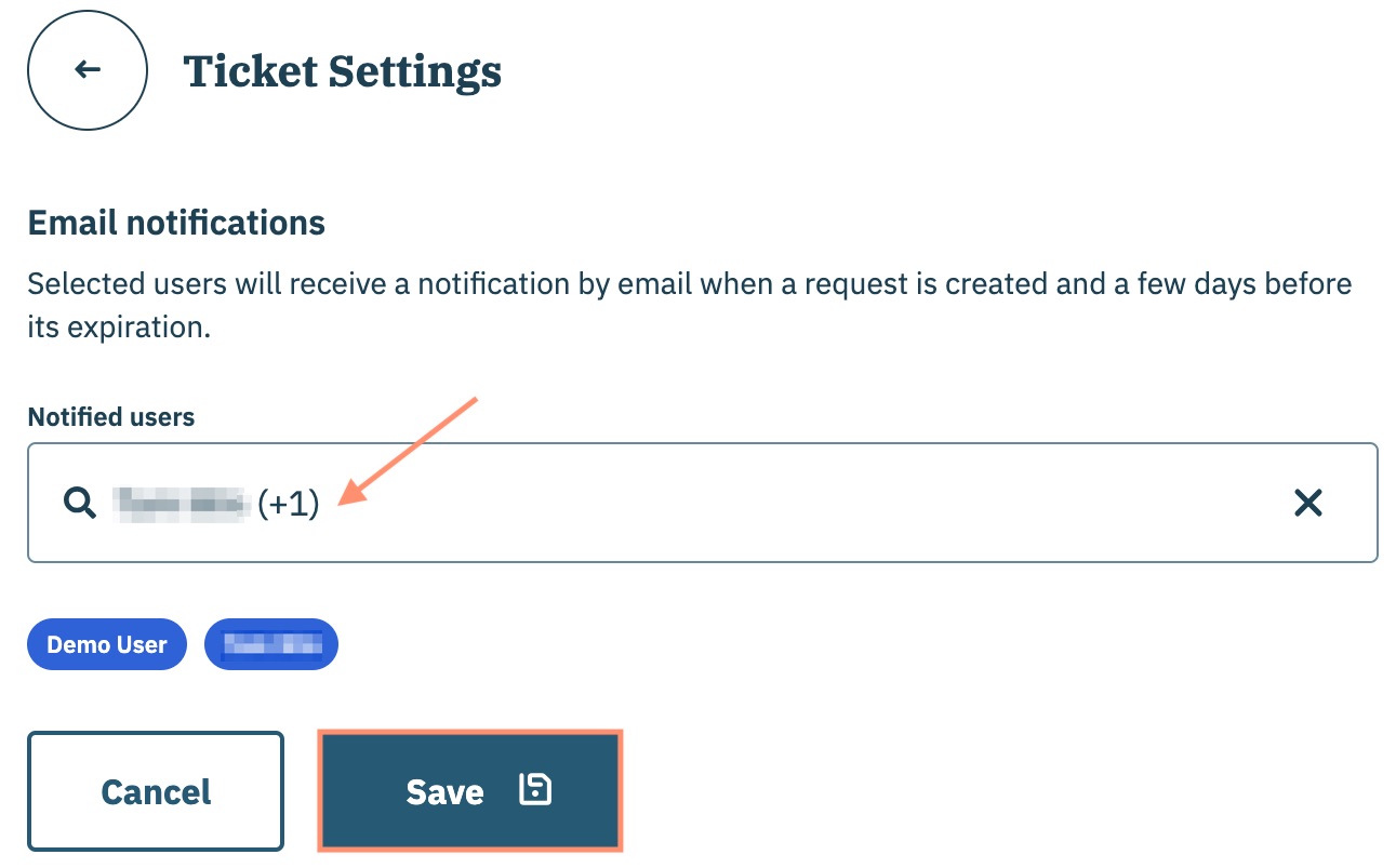 Sur la page suivante, accédez au **Utilisateurs notifiés** menu déroulant et sélectionnez les utilisateurs de votre organisation qui recevront les notifications de demande d'utilisateur.&#x20;