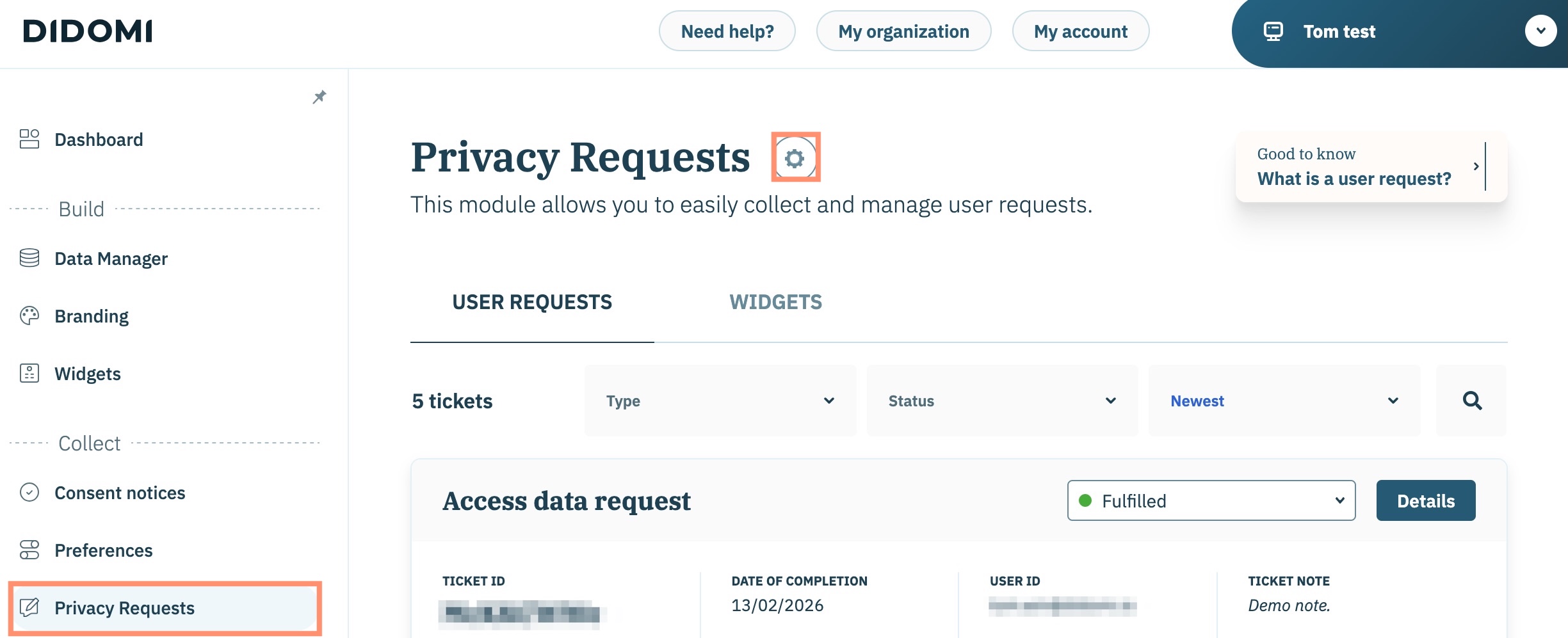Pour configurer les utilisateurs de votre organisation qui recevront les notifications de demande d'utilisateur, cliquez sur **Demandes de confidentialité** dans le panneau de gauche et sélectionnez la **icône d'engrenage** en ligne avec le titre de la page.
