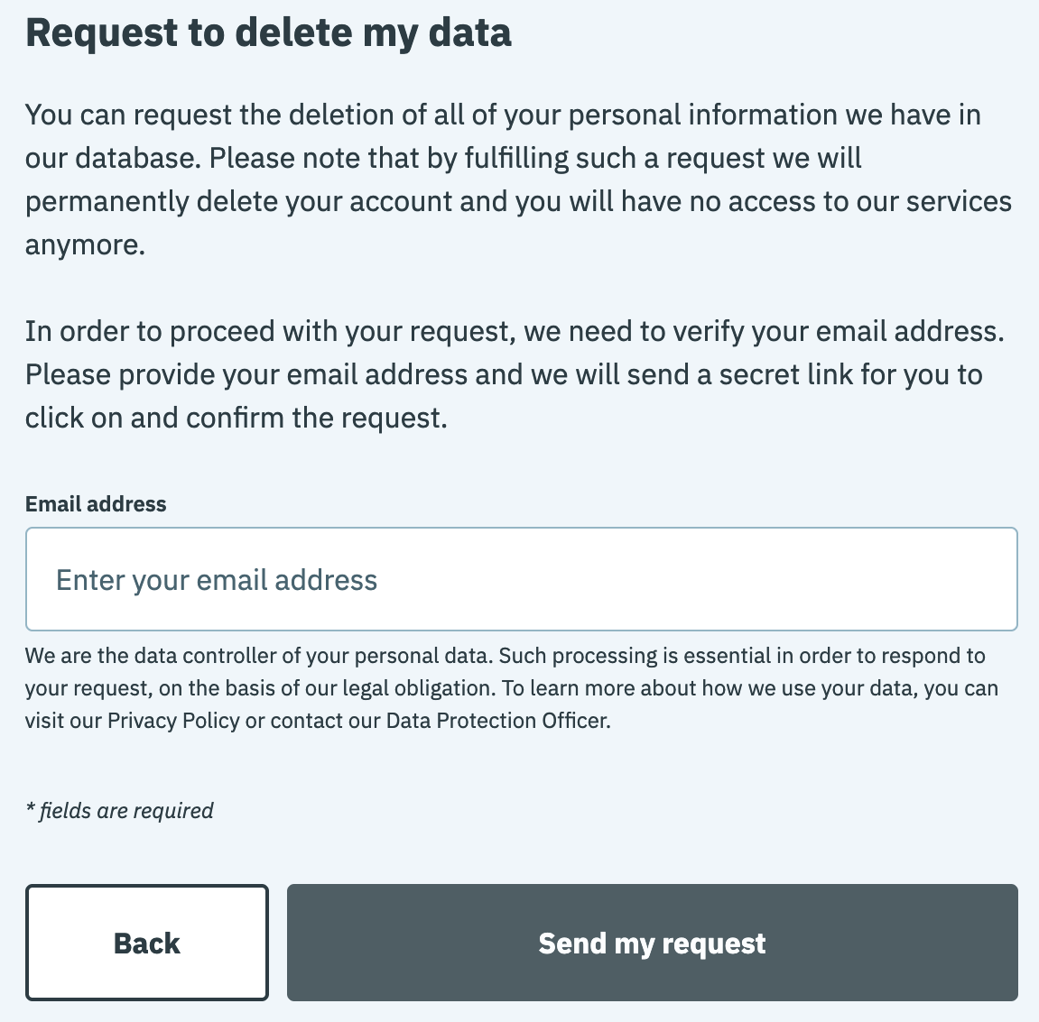 Un widget de demande de confidentialité est un formulaire destiné à l'utilisateur final qui est intégré sur le site web de votre organisation afin que les utilisateurs puissent soumettre leur demande d'accès aux données personnelles (DSAR). Chaque widget de demande de confidentialité est composé de deux écrans :