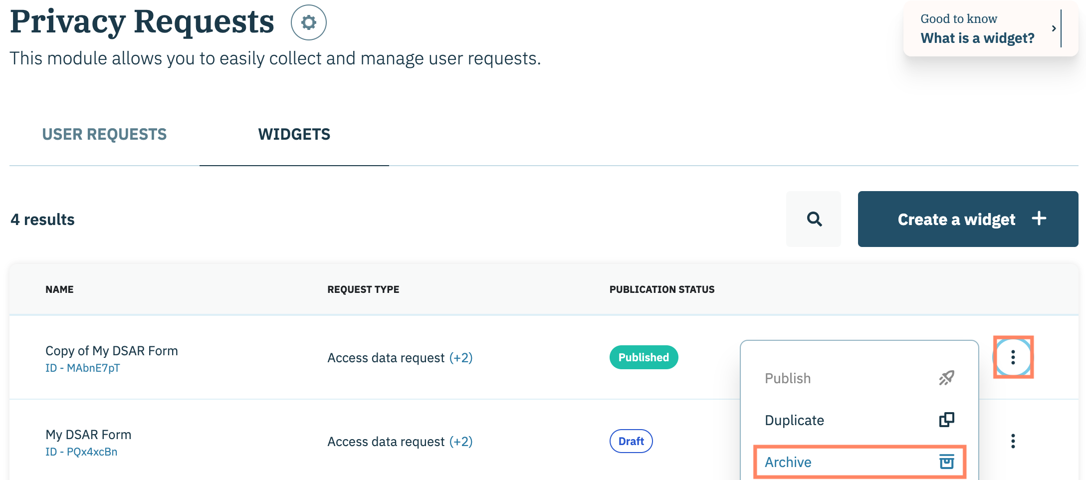 **Remarque**: Une fois qu'un widget de demande de confidentialité est archivé, il ne peut plus être modifié, republié ou dupliqué.