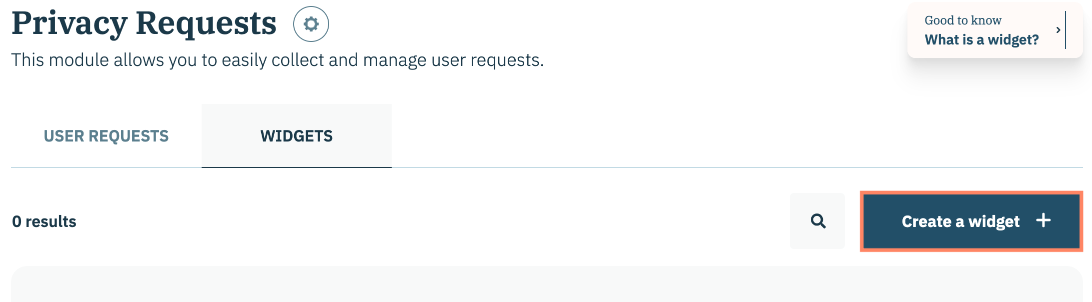 Cliquez sur **Créer un widget +** pour ajouter un nouveau widget de demande de confidentialité à la liste.&#x20;