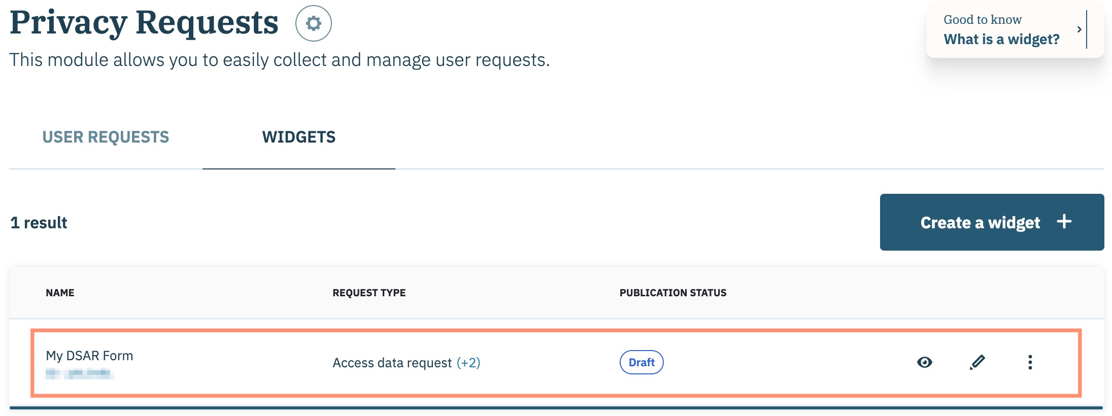 Un nouveau widget de demande de confidentialité avec un **Brouillon** [statut de publication](https://docs.didomi.io/moIvfcA7NSpjmwGZ7dzv/fr/demandes-de-confidentialite/widgets-de-demandes-de-confidentialite/glossaire-du-statut-du-widget-de-demande-de-confidentialite) sera ajouté à la liste de votre organisation.