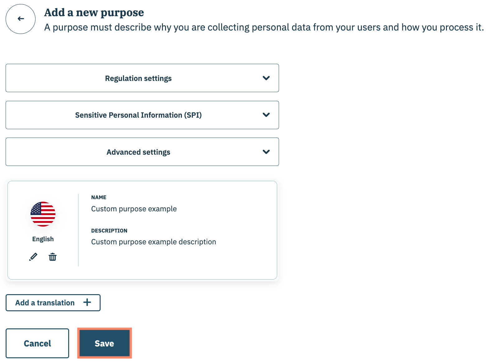 **Remarque**: Une fois la finalité personnalisée créée, Didomi générera un ID de finalité unique qui sera utilisé pour identifier la finalité dans les requêtes API.&#x20;