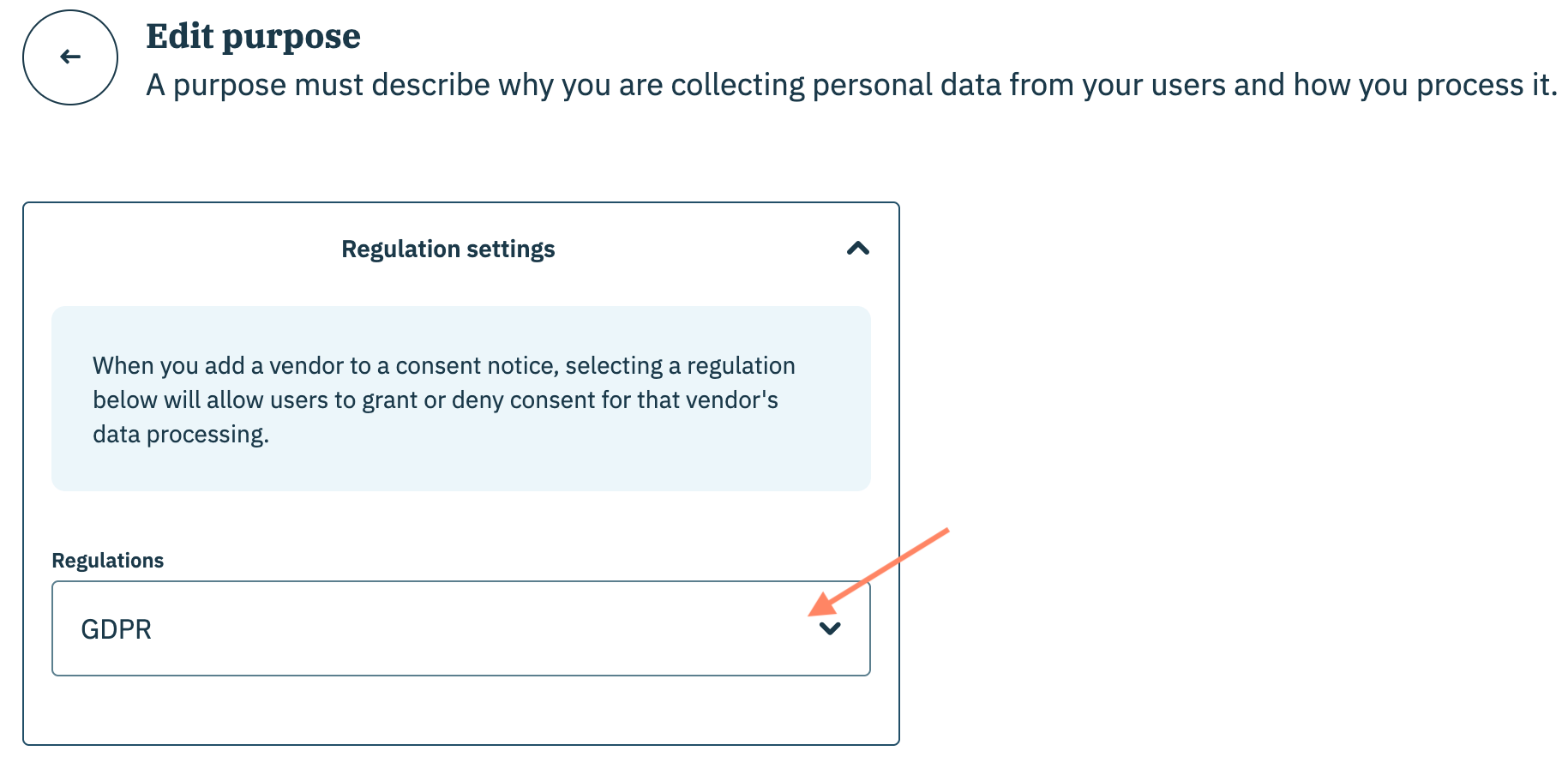Le seul attribut modifiable pour un objectif global est le **Paramètres de réglementation**. Par défaut, Didomi associe les objectifs globaux aux réglementations qui ont explicitement des signaux pour l'objectif mais votre organisation peut étendre davantage l'objectif afin qu'il soit inclus dans d'autres réglementations.