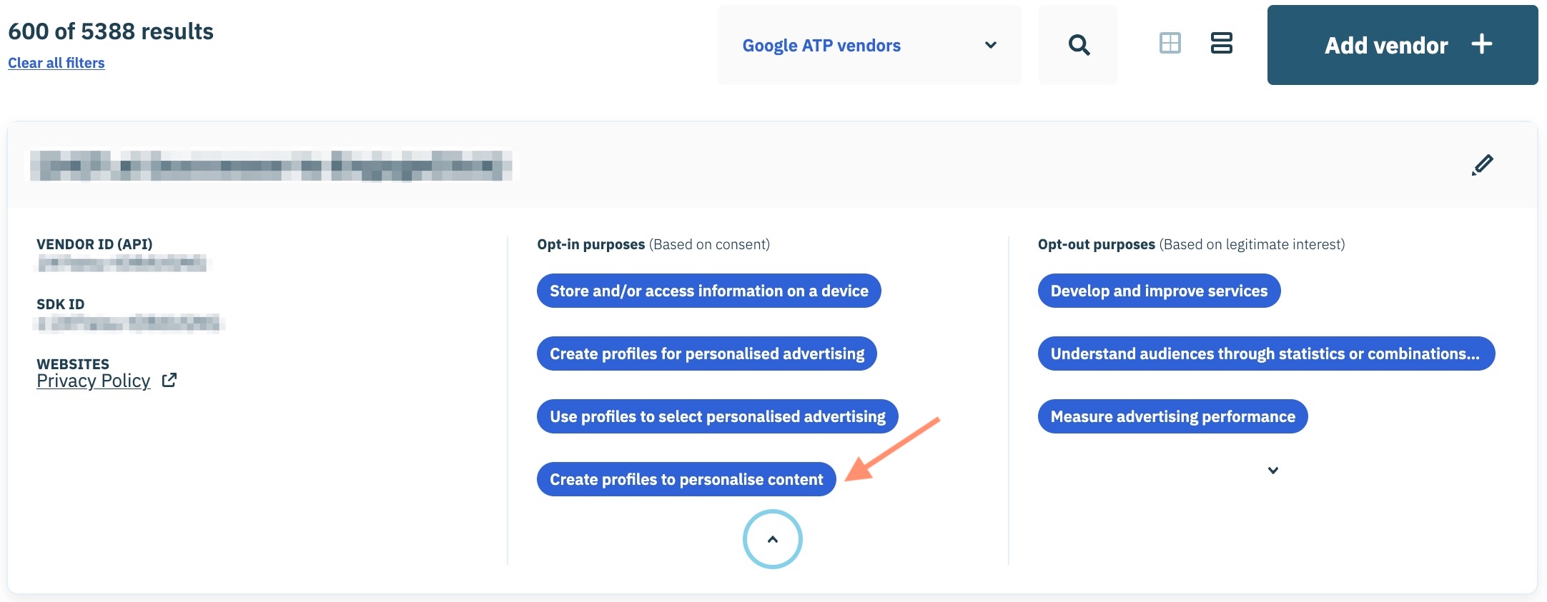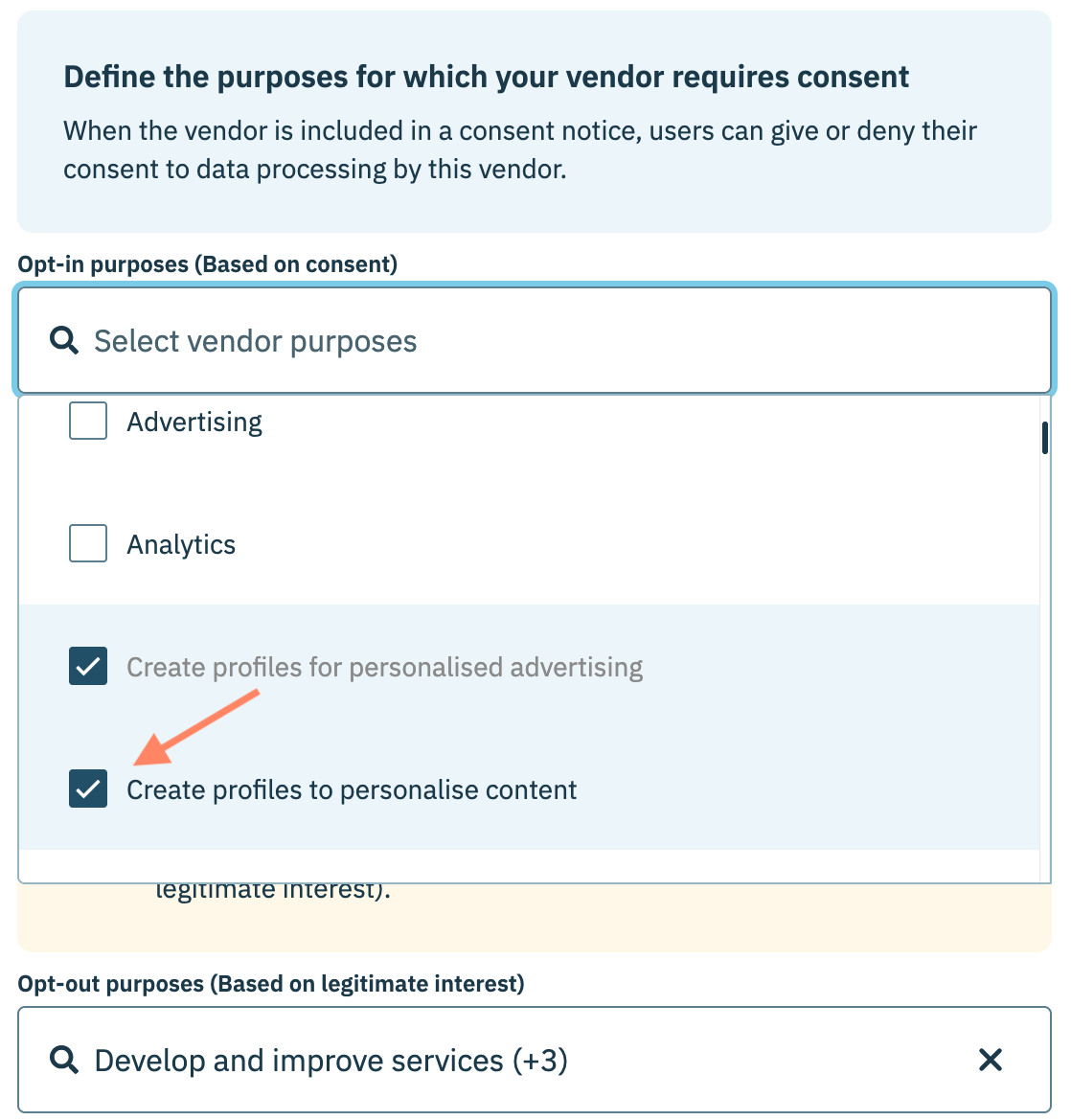 Depuis la page de configuration du fournisseur, accédez au **opt-in purposes** ou **opt-out purposes** menu déroulant respectif et sélectionnez la finalité souhaitée à ajouter au fournisseur.
