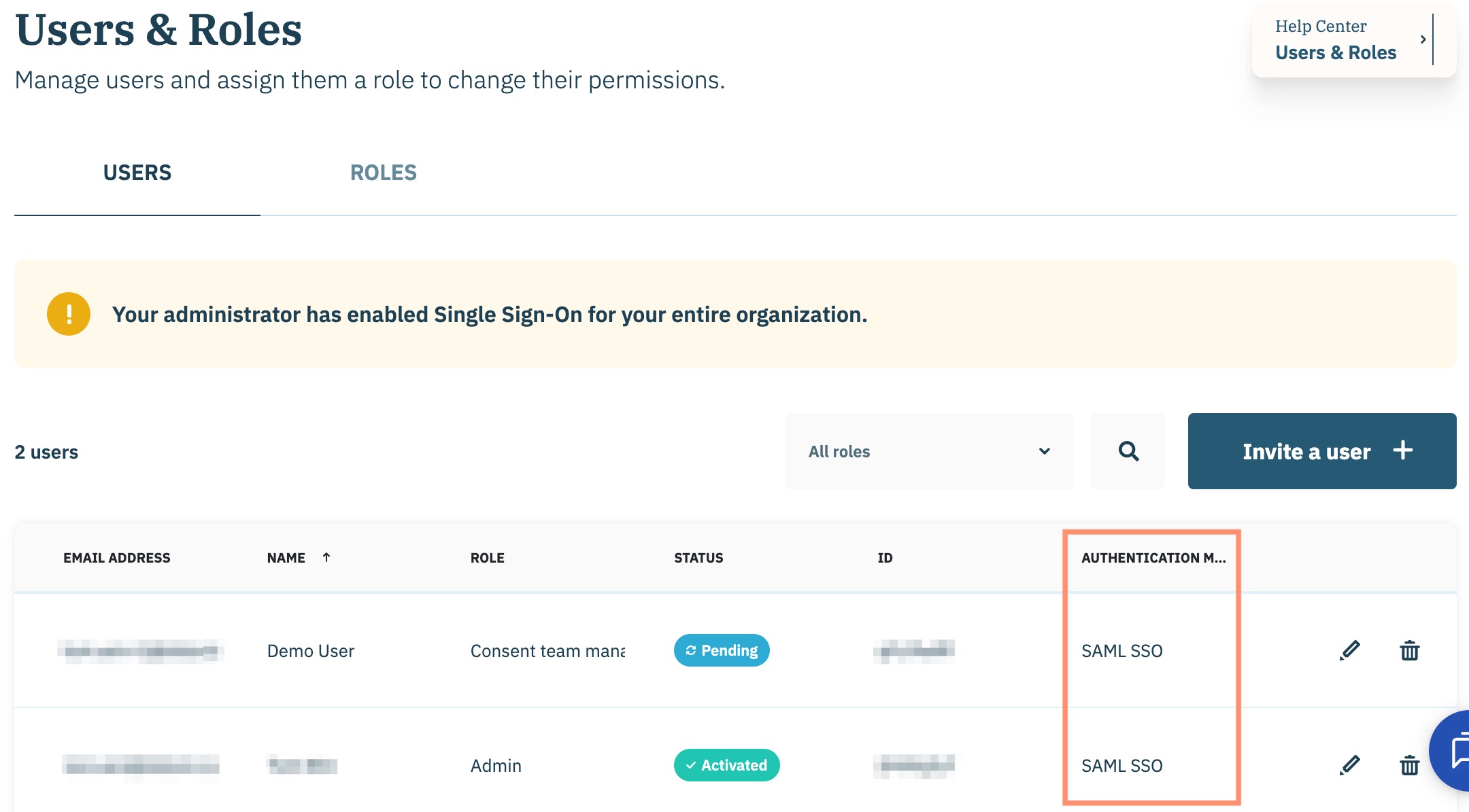 Les nouveaux utilisateurs ajoutés au compte Didomi de votre organisation pourront utiliser exclusivement le SAML SSO pour s'authentifier sur votre compte.&#x20;