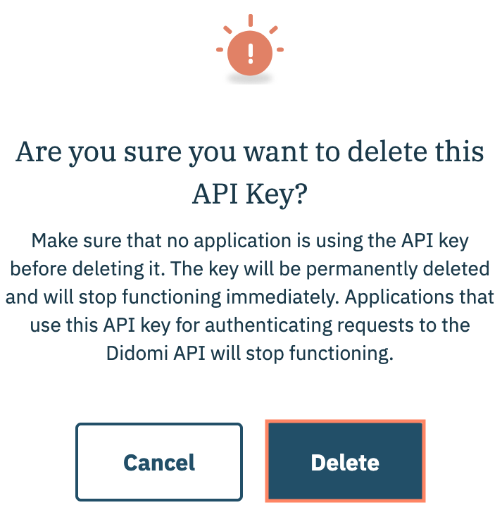 Confirmez la décision de supprimer la clé API privée du compte Didomi de votre organisation dans la fenêtre modale suivante et cliquez sur **Supprimer**.