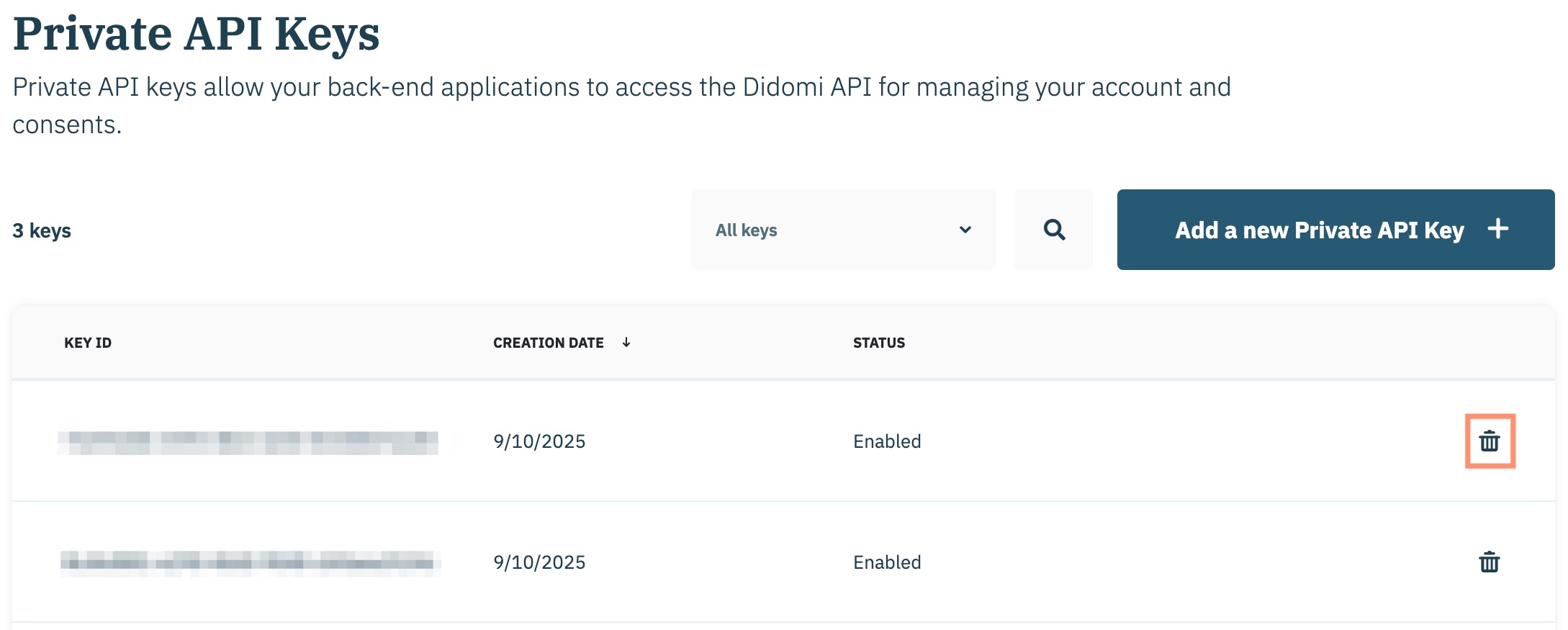 Les clés API privées sont générées par votre organisation et permettent à vos applications back-end d'accéder à l'API Didomi. Dans cet article, nous expliquerons comment supprimer une clé API privée existante du compte de votre organisation.