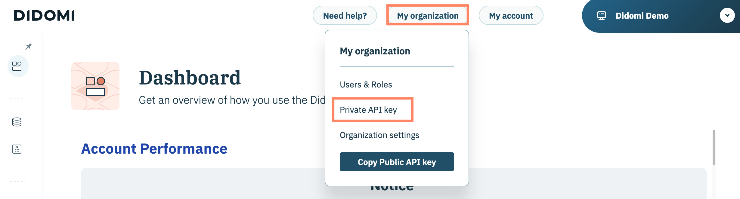 Cliquez sur **Mon organisation** et sélectionnez **Clé API privée** dans le menu déroulant.&#x20;