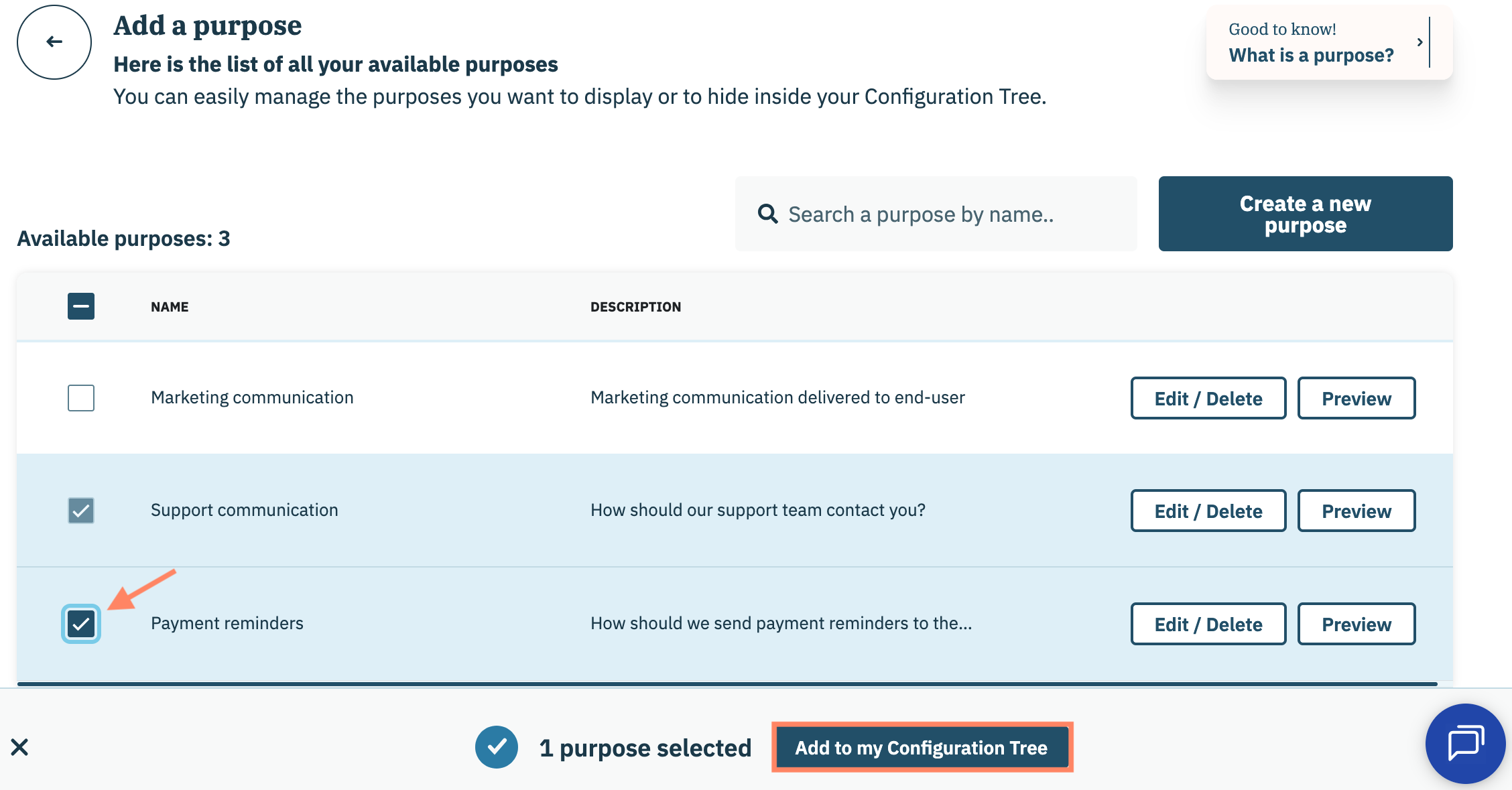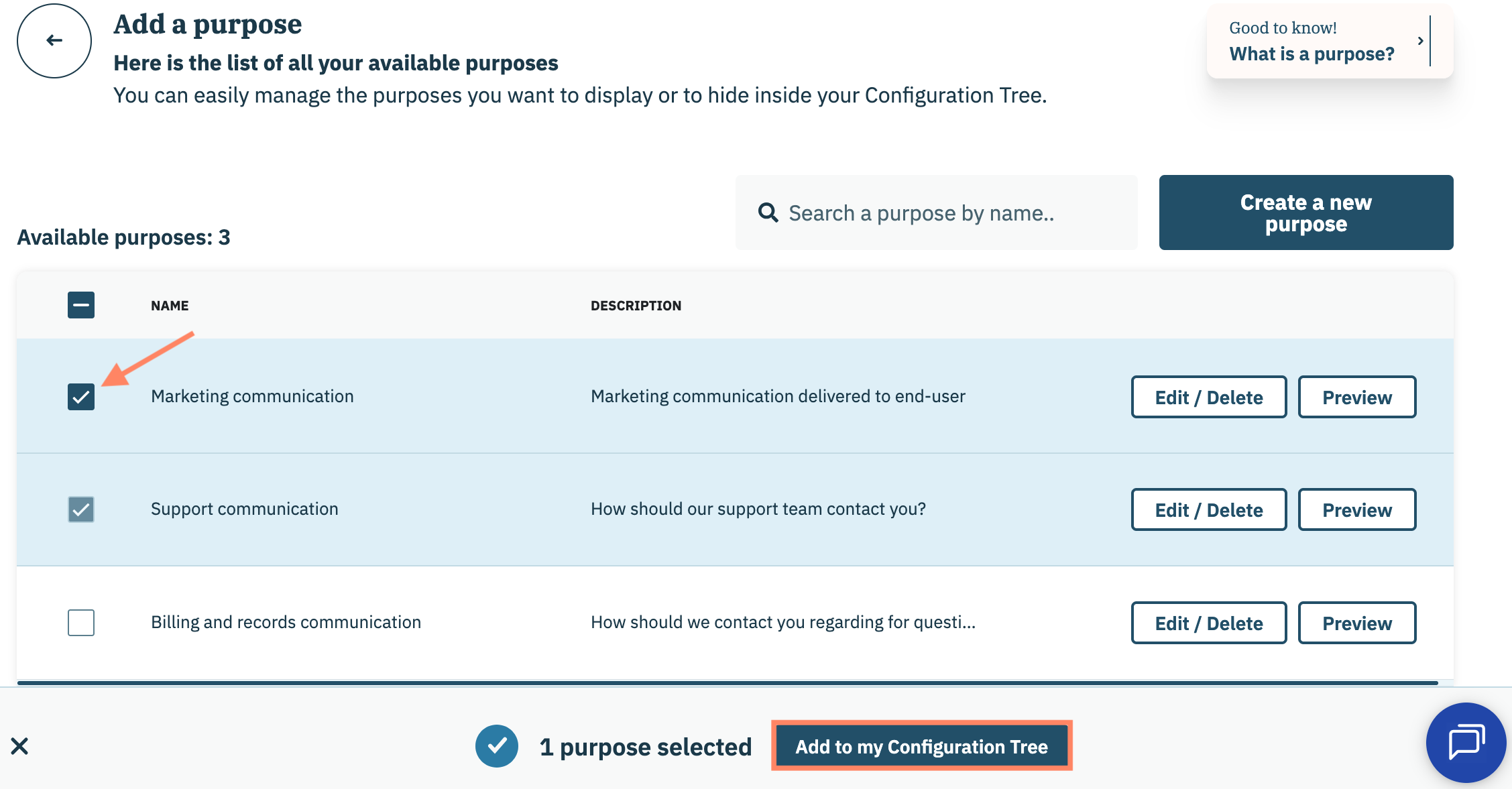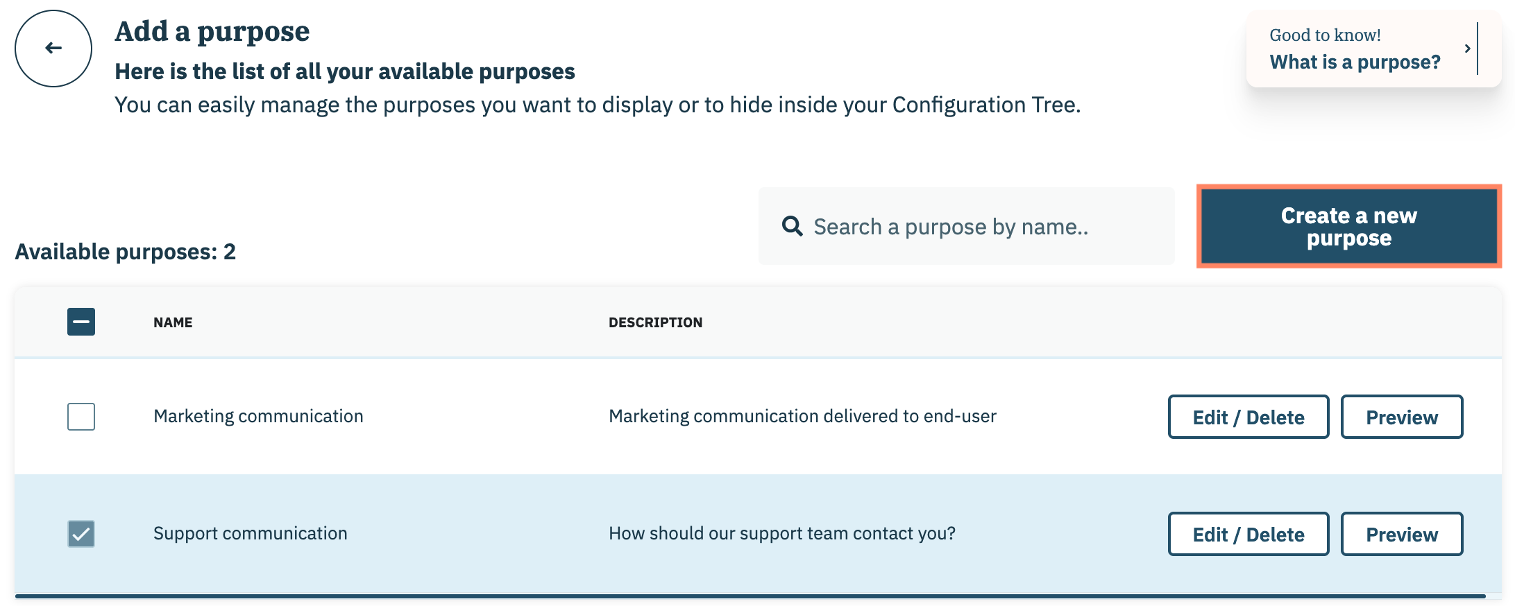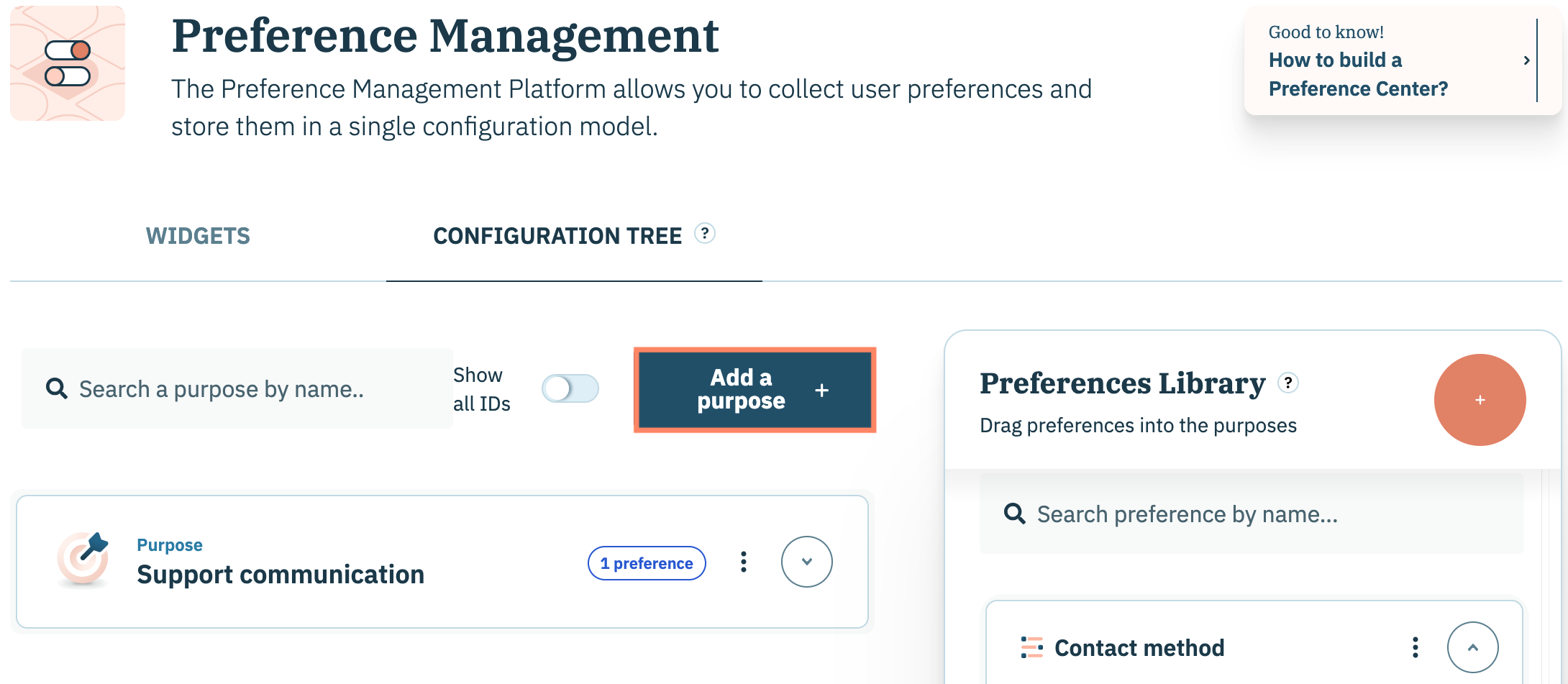 Un objectif décrit la raison pour laquelle votre organisation collecte les données de préférence de l'utilisateur final dans votre arbre de configuration PMP. Dans cet article, nous expliquerons comment ajouter un objectif à votre arbre de configuration PMP afin que vous puissiez ensuite y mapper une ou plusieurs préférences.&#x20;