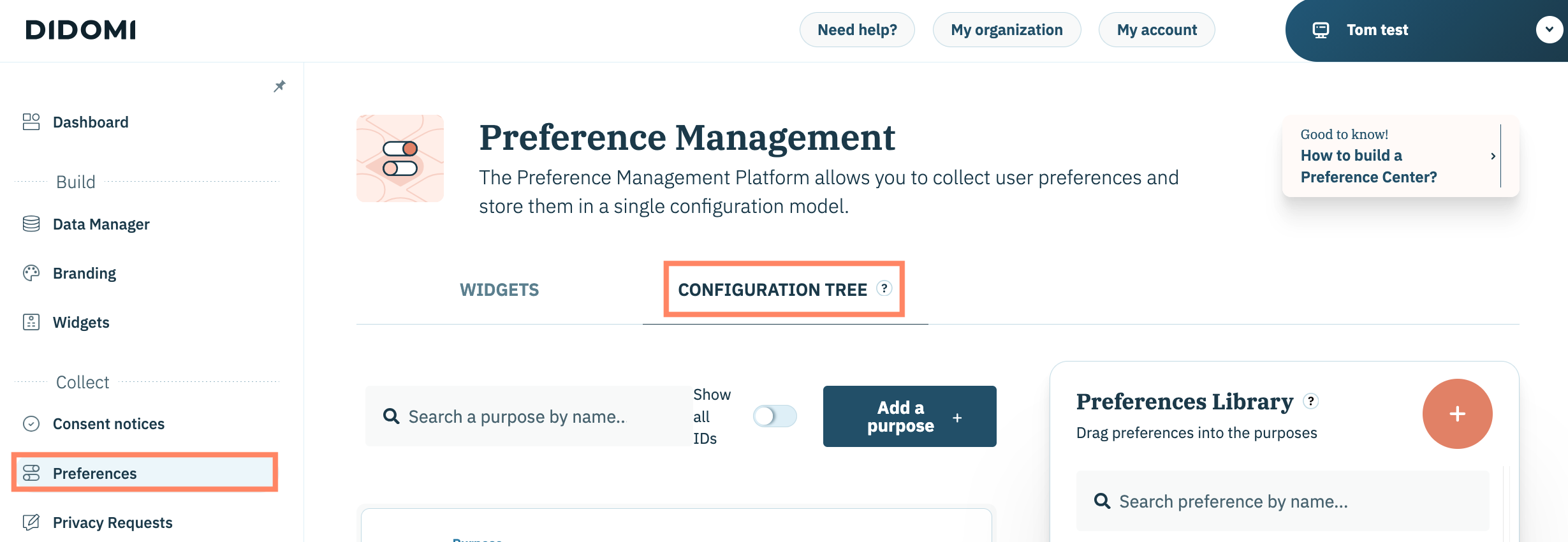 Pour configurer une règle de traitement pour une finalité dans votre arborescence de configuration, cliquez **Préférences** dans le panneau de gauche et sélectionnez la **Arbre de configuration** onglet sur la page suivante.