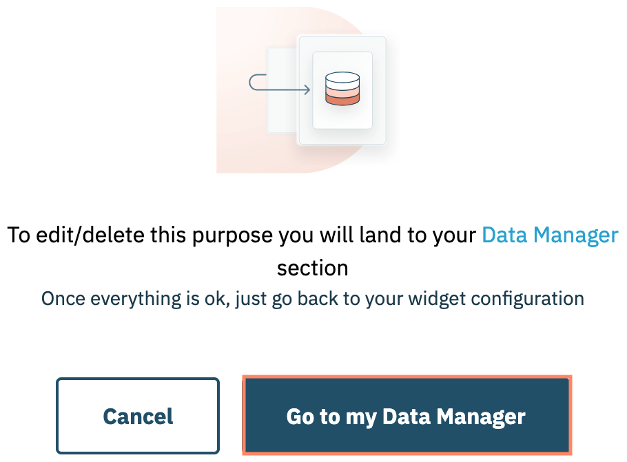 Une fenêtre modale confirmera que la modification d'une finalité ne peut être effectuée que via le gestionnaire de données. Cliquez **Aller à mon gestionnaire de données** pour continuer.