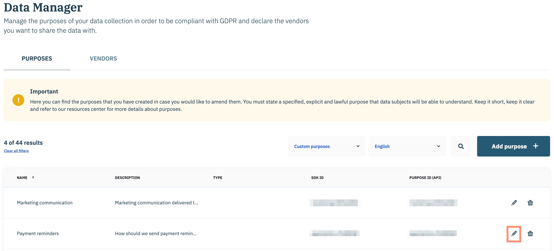 Vous serez redirigé vers la section gestionnaire de données de votre console Didomi avec une vue filtrée de vos finalités personnalisées. Accédez à la finalité souhaitée et cliquez sur l' **Modifier** icône en ligne avec le nom de la finalité.&#x20;