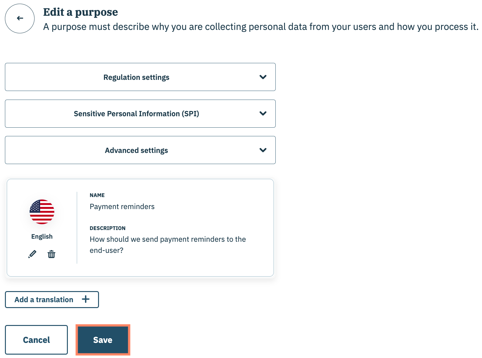 Les informations liées à un finalité au sein de votre arbre de configuration PMP sont gérées dans le gestionnaire de données de votre organisation (même pour les finalités ajoutées directement depuis le flux de travail de l'arbre de configuration). Dans cet article, nous expliquerons comment modifier une finalité qui a été ajoutée à votre arbre de configuration PMP.&#x20;