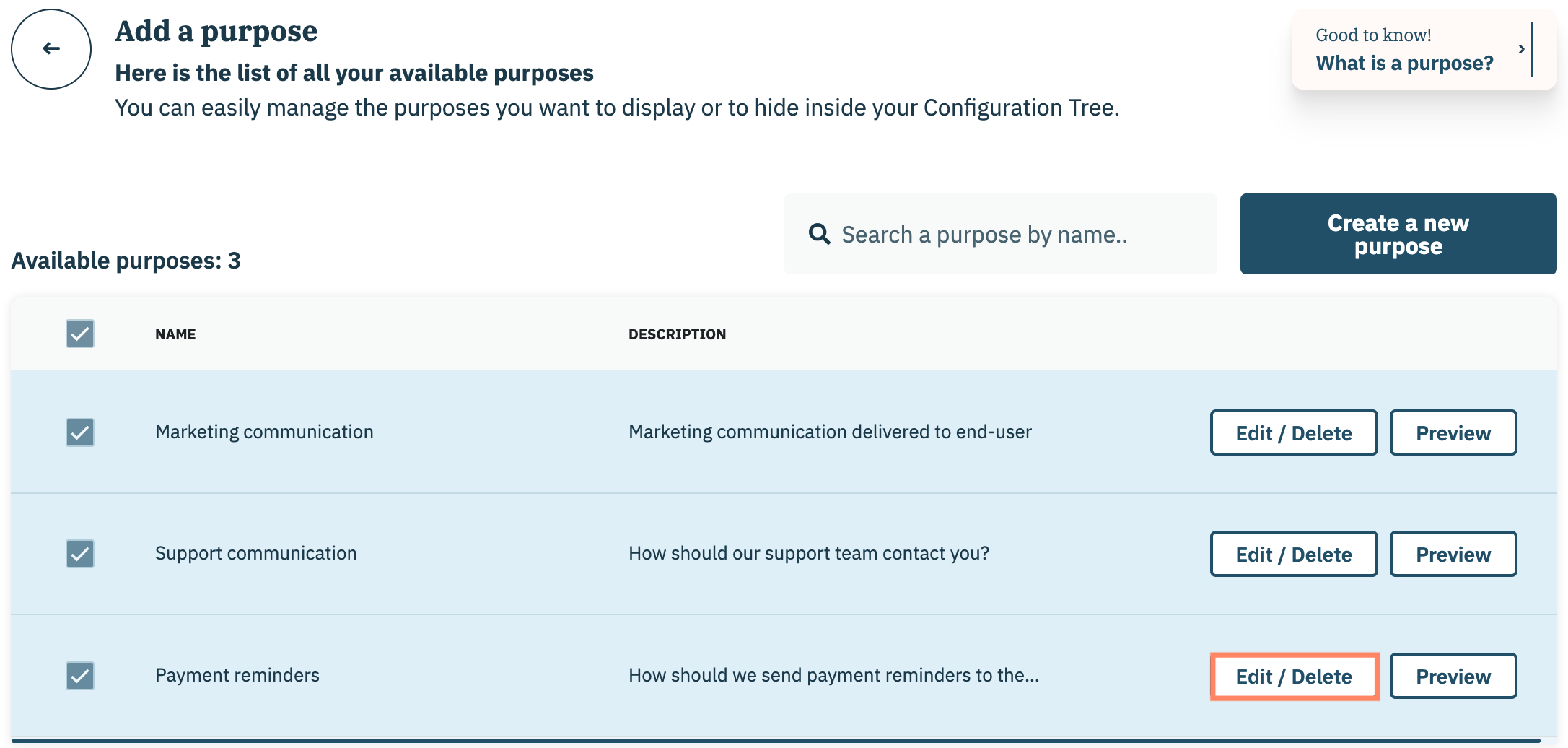 Accédez à la finalité souhaitée dans la liste et cliquez **Modifier/Supprimer** en ligne avec le nom de la finalité.