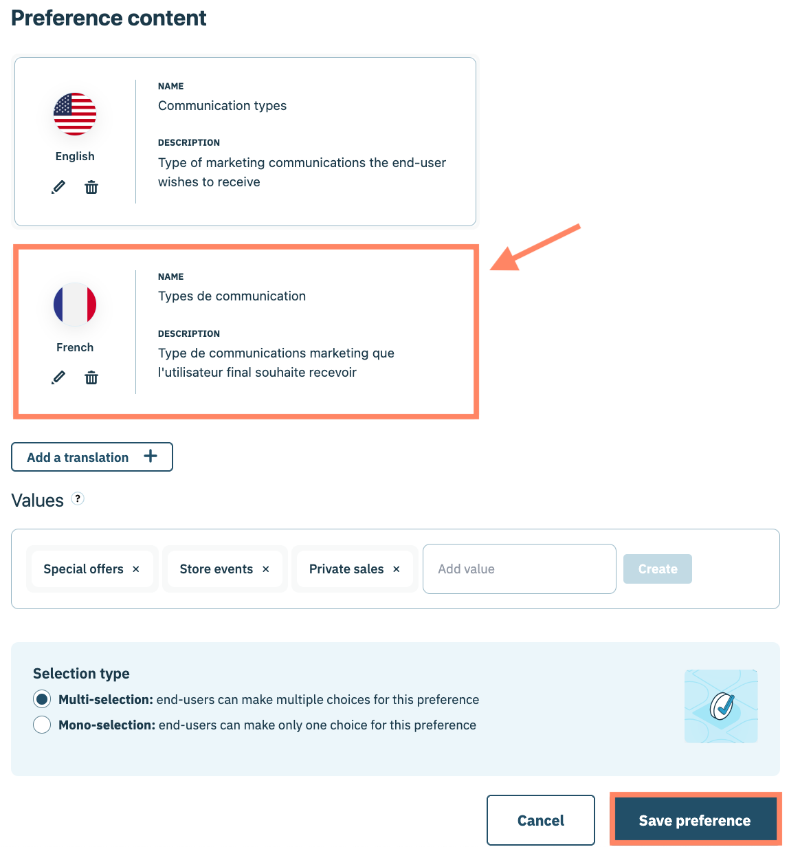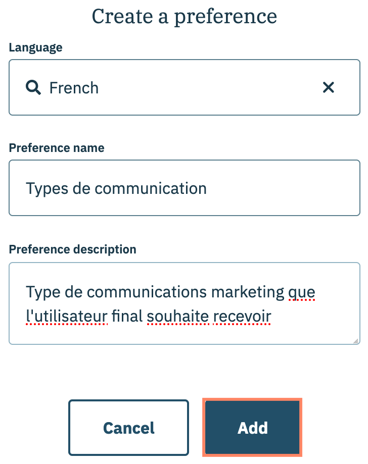 La traduction sera ajoutée à la préférence. Cliquez **Enregistrer la préférence** pour confirmer l'ajout.