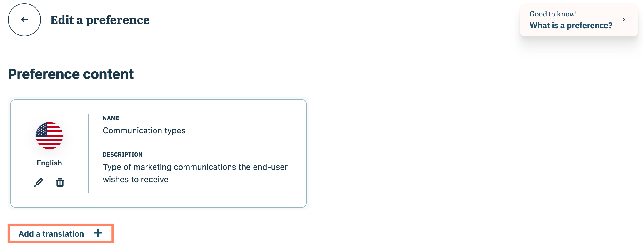 Le nom et la description d'une préférence peuvent être affichés dans votre widget de préférences dans une variété de langues prises en charge par Didomi. Ces traductions peuvent être affichées dynamiquement en fonction des paramètres du navigateur de l'utilisateur final ou appliquées pour tous les utilisateurs finaux. Dans cet article, nous verrons comment ajouter une traduction à une préférence via la bibliothèque de préférences.