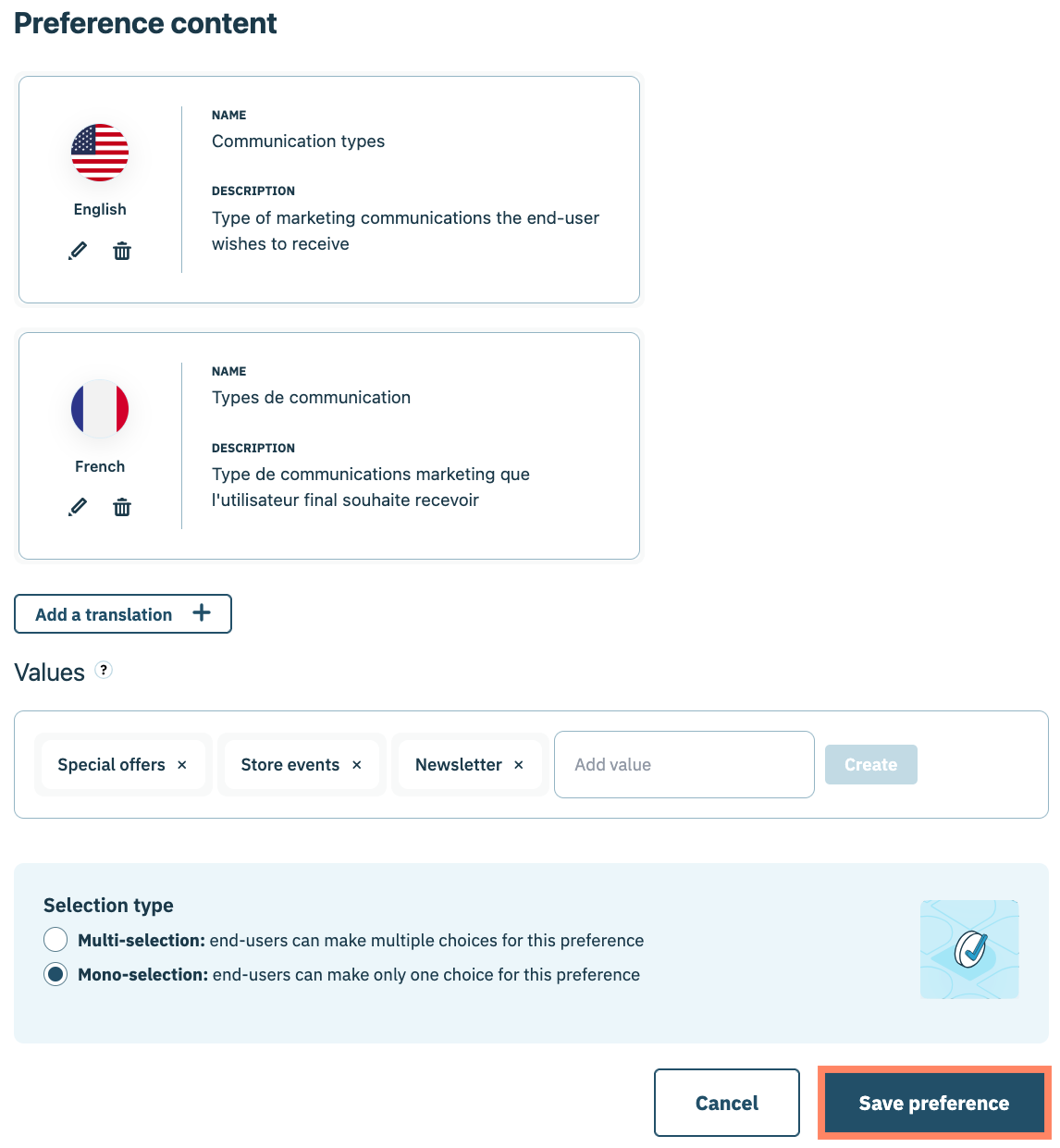 Une préférence est un point de collecte de données concernant les intentions, décisions, motivations et intérêts d'un utilisateur final (par ex. son mode de contact préféré). Dans cet article, nous expliquerons comment modifier une préférence existante dans votre bibliothèque de préférences et comment ces modifications sont déployées vers les widgets de préférences qui peuvent utiliser ces préférences.