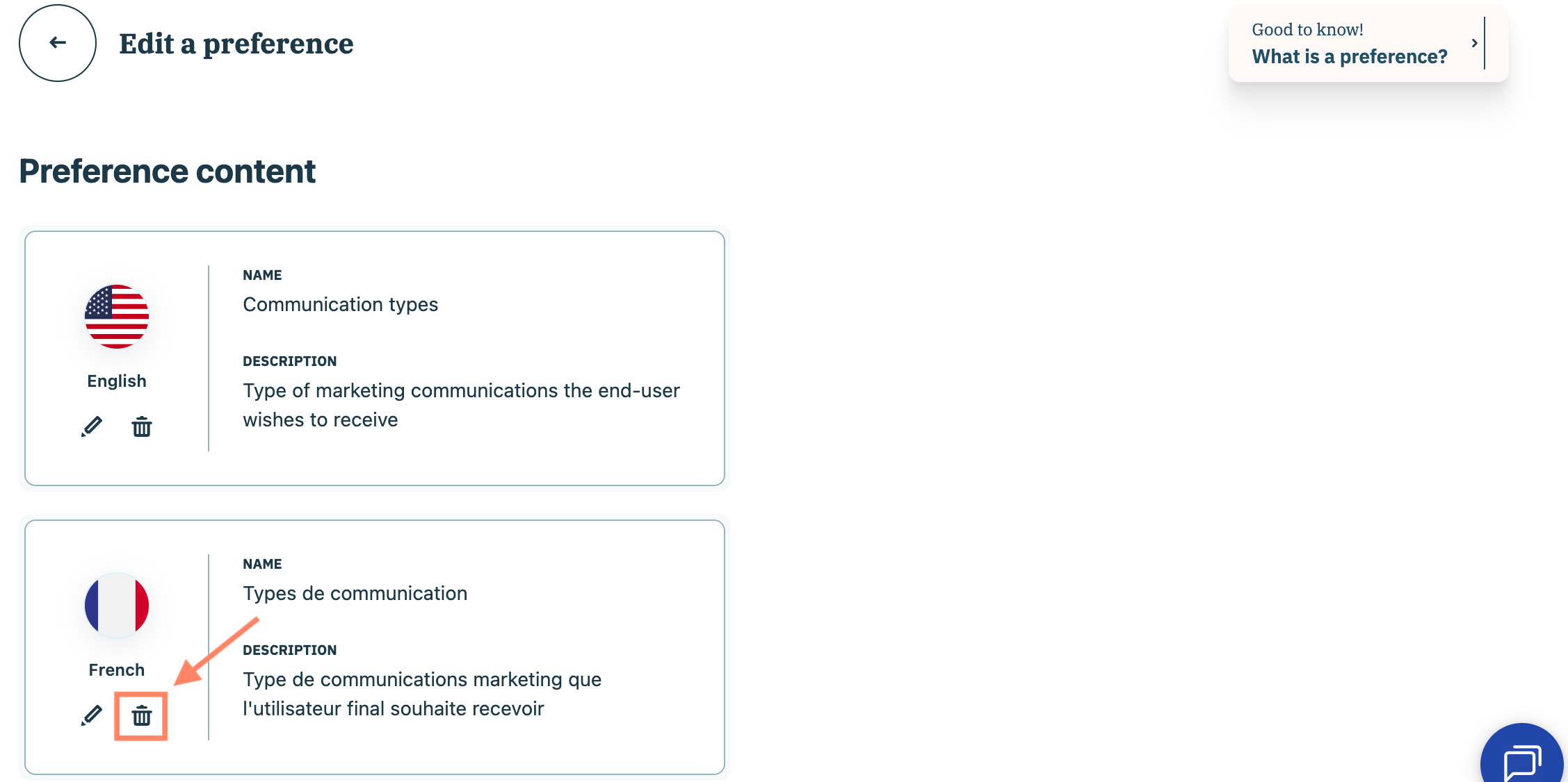 Cliquez sur **Enregistrer la préférence** pour confirmer la suppression de la traduction.