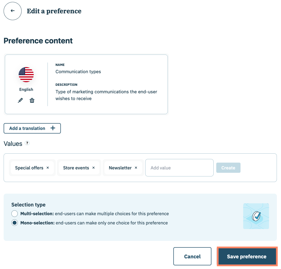 Toute modification de traduction effectuée depuis le widget PMP n'affectera pas les traductions stockées pour la préférence dans la bibliothèque de préférences. [Cliquez ici](https://docs.didomi.io/moIvfcA7NSpjmwGZ7dzv/fr/plateforme-de-gestion-des-preferences-pmp/widgets-de-preferences/gerer-les-traductions-du-widget-de-preferences) pour en savoir plus sur la suppression des traductions stockées par widget.