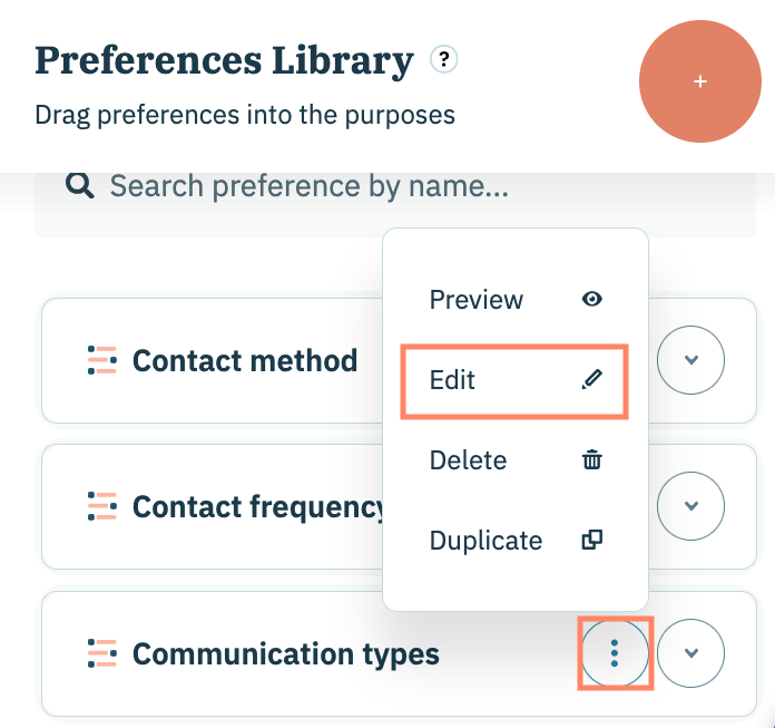 Accédez à une préférence dans votre bibliothèque de préférences et sélectionnez l' **points de suspension** icône en ligne avec le nom de la préférence. Cliquez **Modifier** dans le menu.