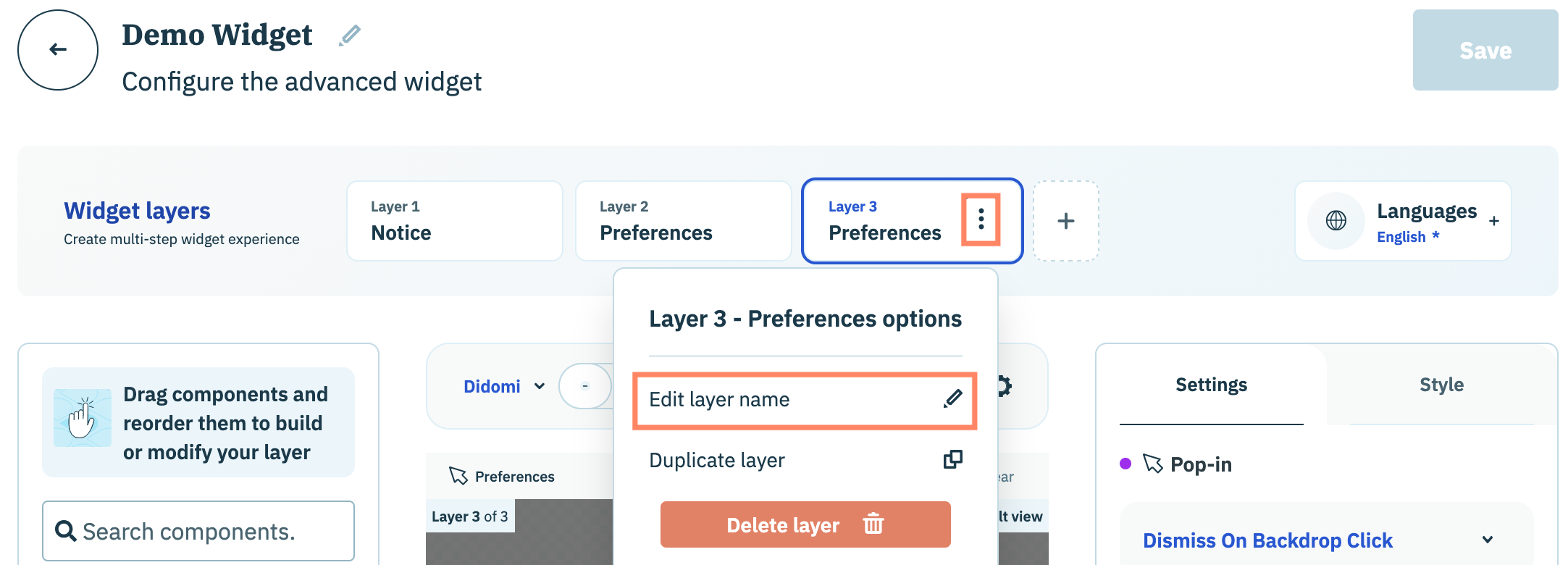 For any newly created widget, Didomi provides a number of default layers to help your organization get started. These default layers can be customized with components, renamed, and/or deleted.&#x20;