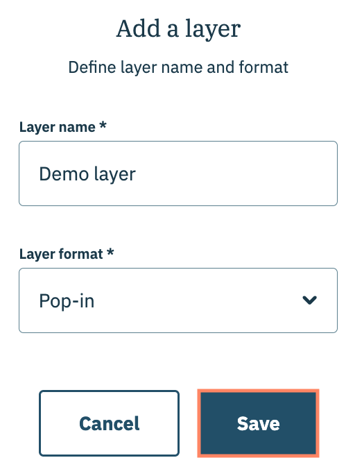Use the subsequent modal to give the layer a name and to select the format of the layer (pop in, top banner, etc... and click **Save** when finished.